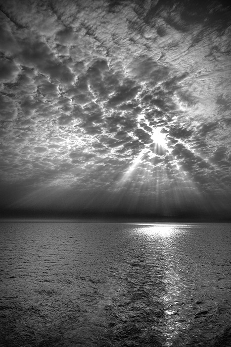 Sun Rays Clouds Water Waves Shine Reflection Light Dramatic Black White Sky Distance Background Horizon