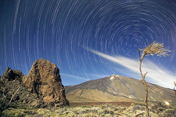 Star Streaks Sky Night Moonlit Moon Light El Teide Mountain Tenerife Earth Rotation Circular Motion Concentric Rings Rocks Tree Cloud